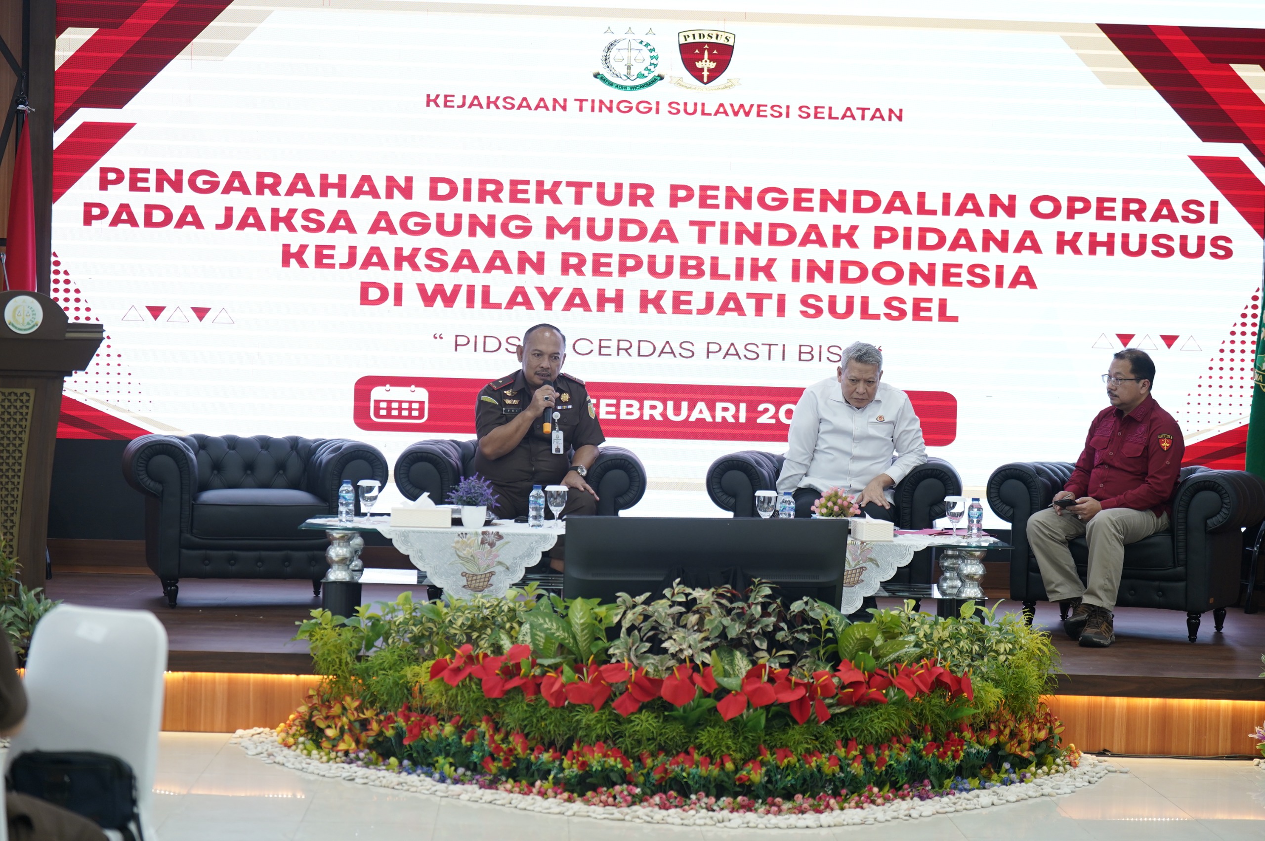 MAKASSAR– Wakil Kepala Kejaksaan Tinggi Sulawesi Selatan (Wakajati Sulsel), Prihatin, mendampingi Direktur Pengendalian Operasi (Dirdalops) pada Jaksa Agung Muda Bidang Tindak Pidana Khusus (Jampidsus) Kejaksaan Agung RI, Muhammad Syarifuddin, , dalam memberikan pengarahan kepada seluruh jajaran Bidang Tindak Pidana Khusus se-Sulawesi Selatan.
