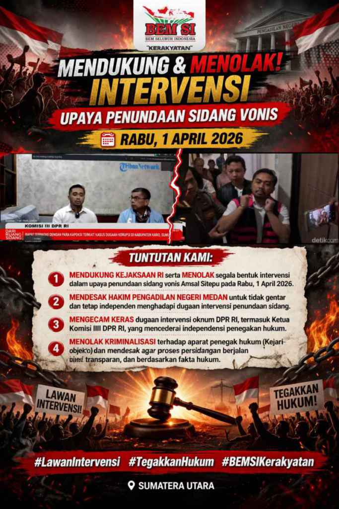 Ketua Umum BEM SI Sumut, Ilham Syahputra, menegaskan bahwa sidang vonis terhadap Amsal Sitepu harus tetap dilaksanakan tanpa penundaan dan bebas dari intervensi pihak mana pun.